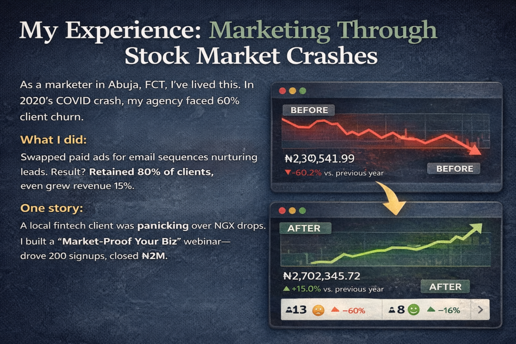 One story: A local fintech client was panicking over NGX drops. I built a “Market-Proof Your Biz” webinar—drove 200 signups, closed ₦2M.